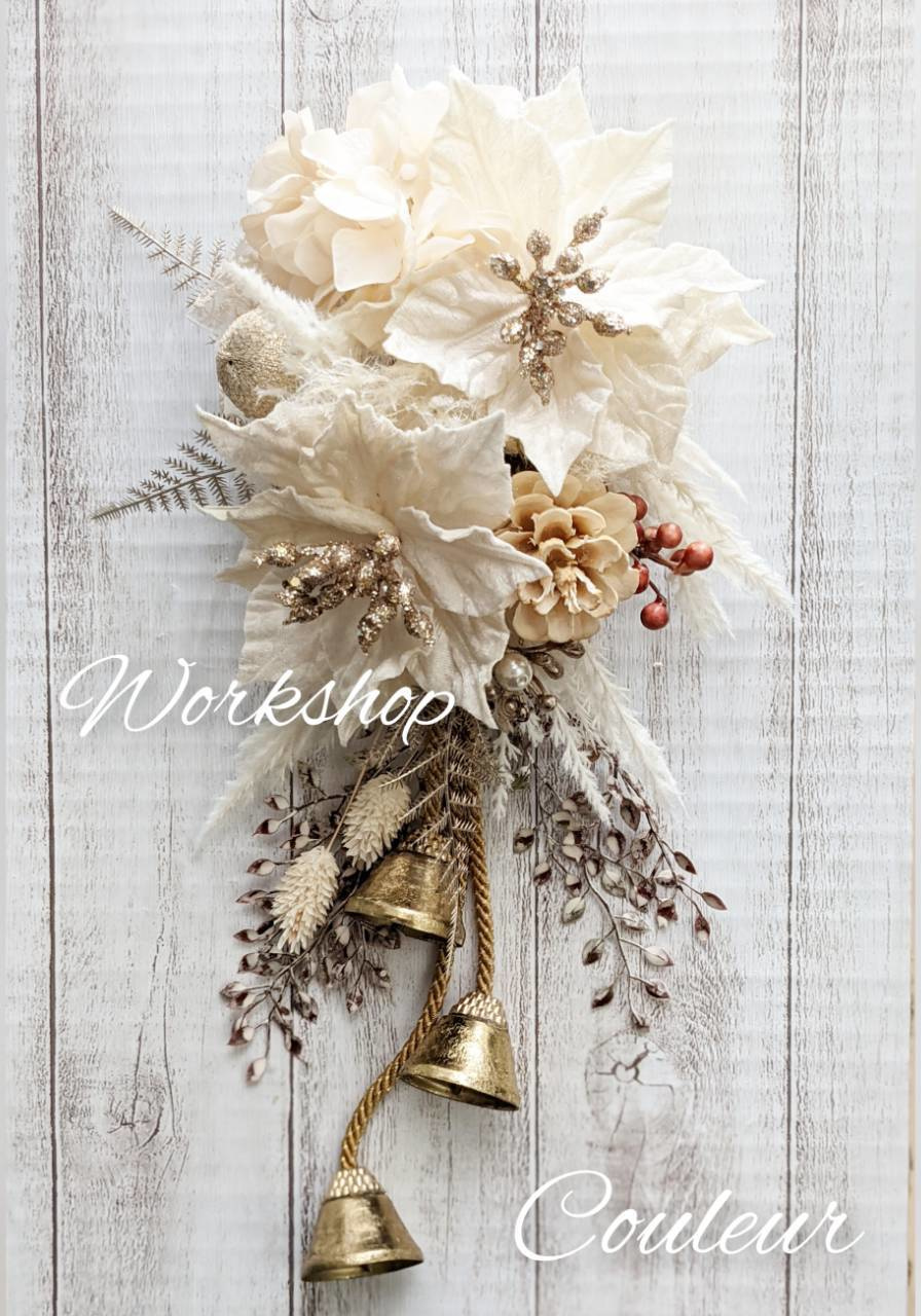 | レッスン内容 | 華やかなクリスマスらしいホワイトベースの壁掛けアレンジ★ アーティシャルフラワー、自然素材の花材を使います。 作品サイズ35×15 クリスマス気分を盛り上げるアレンジをぜひ一緒に作りましょう♪ |