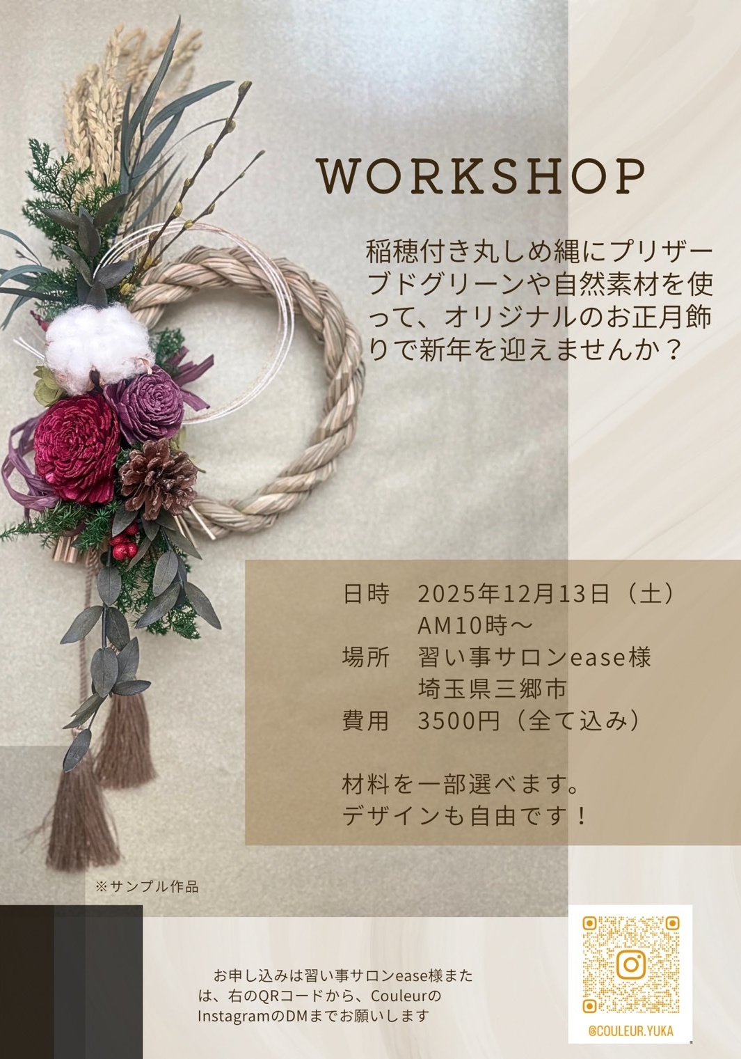 | レッスン内容 | 稲穂付き丸しめ縄にプリザーブドグリーンや 自然素材のグリーンを使って、 オリジナルのお正月飾りを作りませんか? 新年を素敵に盛り上げるしめ縄、ぜひ一緒に作りましょう♪ |